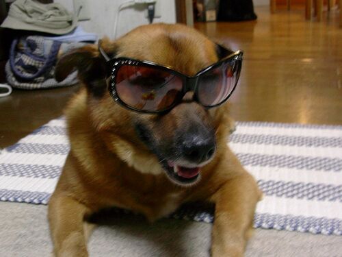 サングラスを買いました★ 3万円しました。 ・・ウソです(笑)300円でした。 これからの季節、犬もサングラスが必要です。 紫外線から目を守るためにね^▽-